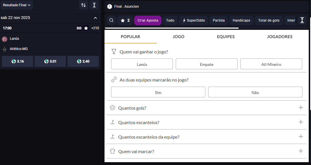 O mercado de “Criar Aposta”, também conhecido como “Bet Builder” é uma funcionalidade que permite a criação uma aposta personalizada combinada dentro de um mesmo evento esportivo. Em vez de selecionar apenas um mercado, como o vencedor da partida ou o total de gols, o apostador pode unir diversas opções, como: